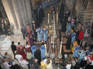 Te Deumが歌われる中、空の墓に入り、復活の信仰を新たにし、聖堂に向かいます。(写真3:総大司教退出)。最初の入堂はいつもカトリックです。そして、カトリックと同じように、「遺体を清めた岩」で主の十字架の死を崇敬し、お墓に入り主の埋葬を悲しみながらも復活の喜びにひたり、それぞれの聖堂に向かいます。ギリシャ。(写真4:ギリシャ入堂)。コプト。(写真5:コプト入堂)。 |